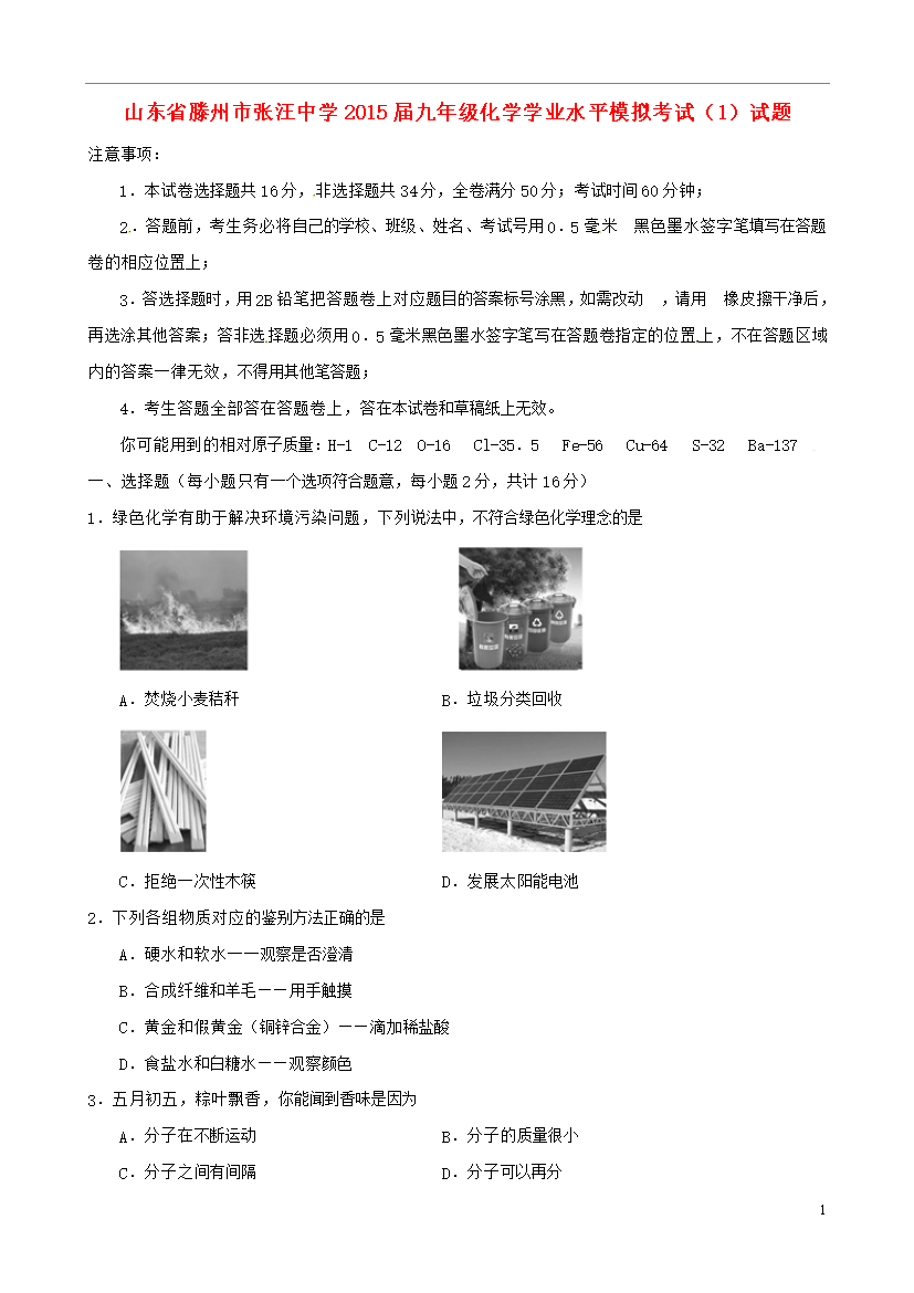 试题-山东-2015_山东省滕州市张汪中学2015届九年级化学学业水平模拟考试试题(1)