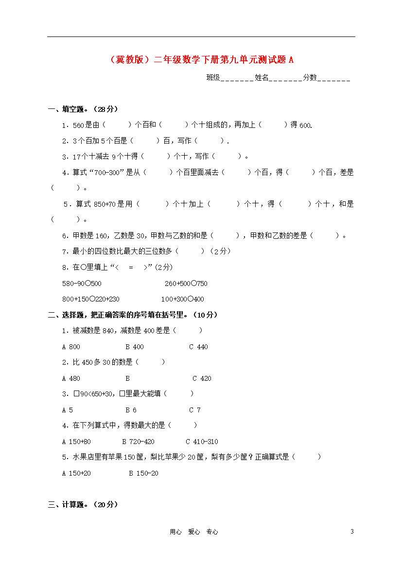试题-全国-2011_二年级数学下册 第九单元测试题A(无答案) 冀教版