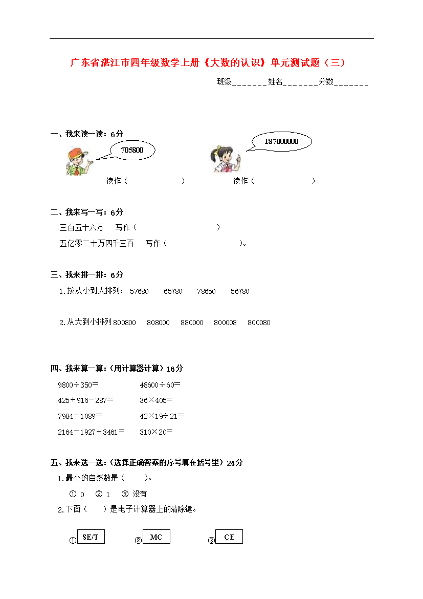 试题-广东-2011_广东省湛江市四年级数学上学期《大数的认识》单元测试题(三)(无答案) 人教新课标版