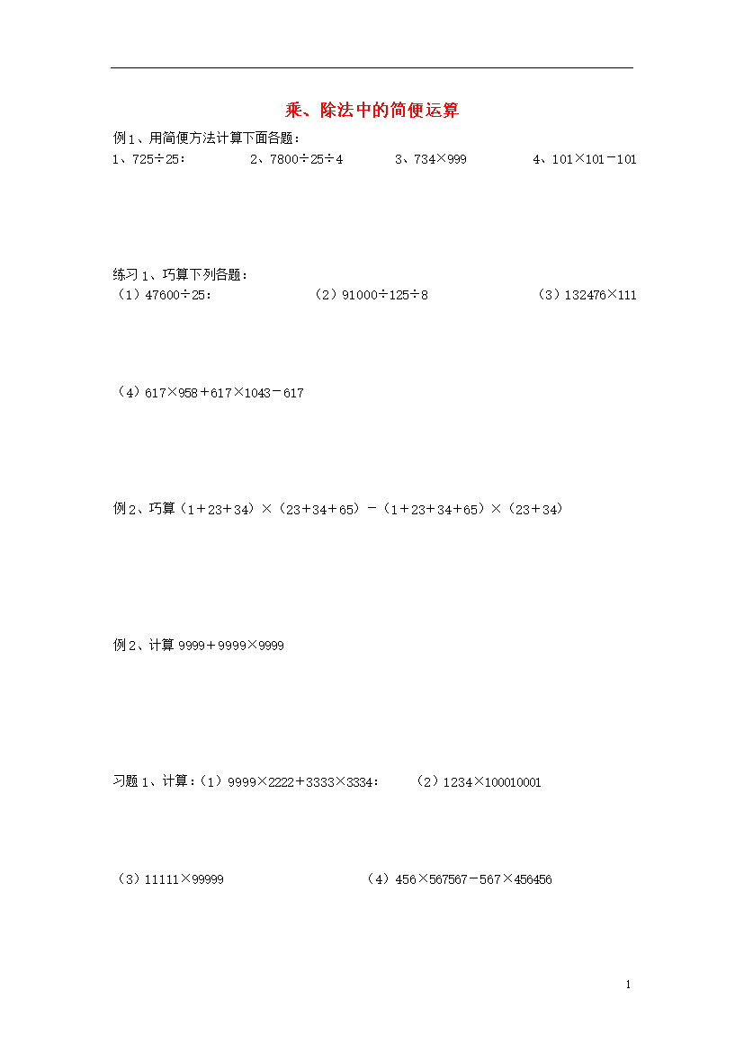试题-全国-2016_2016春四年级数学下册《乘、除法中的简便运算》练习题(无答案) 新人教版