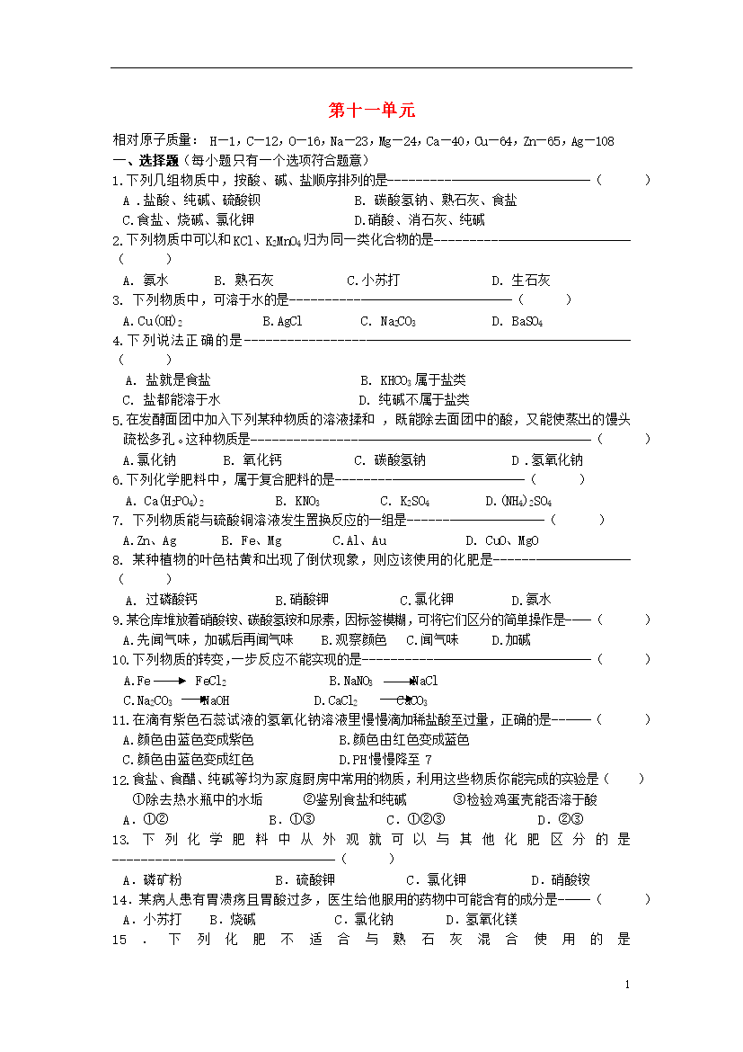 试题-全国-2016_九年级化学下册 第11单元《盐 化肥》综合测试 新人教版