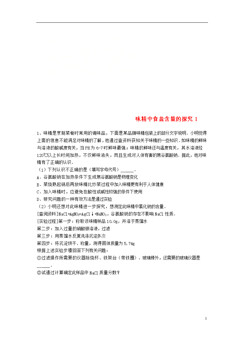 试题-吉林-2018_吉林省吉林市中考化学复习练习 味精中食盐含量的探究1(无答案) 新人教版