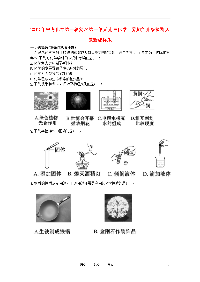试题-全国-2012_2012年中考化学第一轮复习 第一单元 走进化学世界知能升级检测 人教新课标版