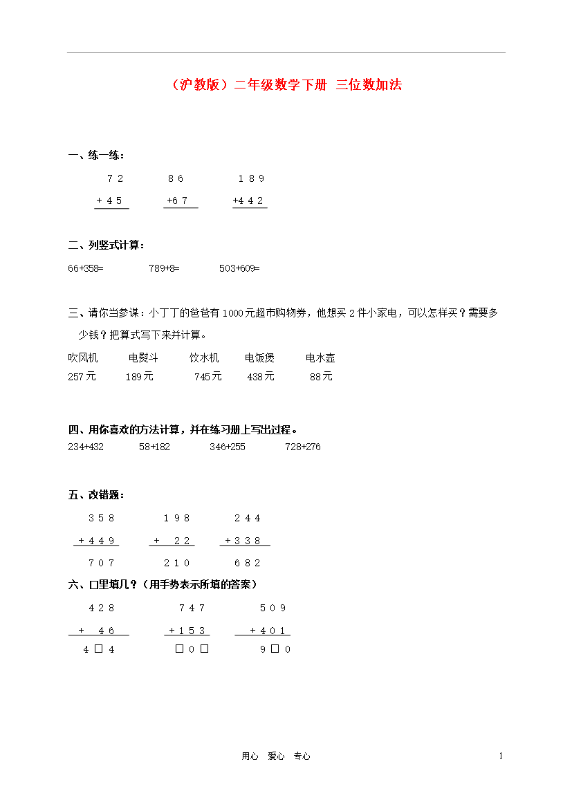 试题-全国-2011_二年级数学下册 三位数加法一课一练(无答案)沪科版