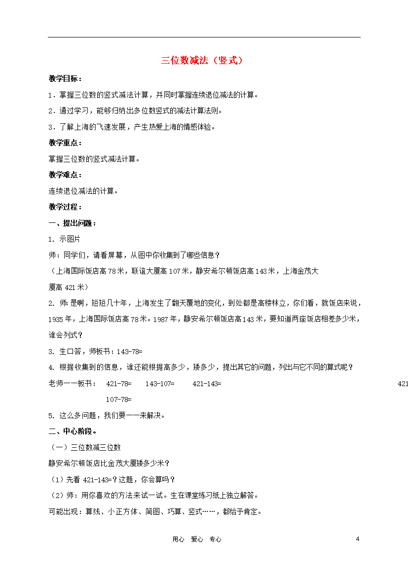 教案-全国-2011_二年级数学下册 三位数减法(竖式)教案 沪科版