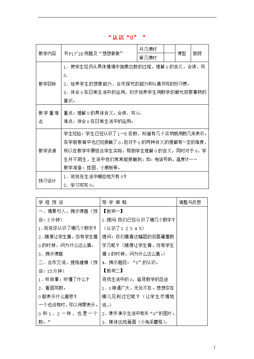 教案-全国-2013_一年级数学上册 认识“0”教案 苏教版