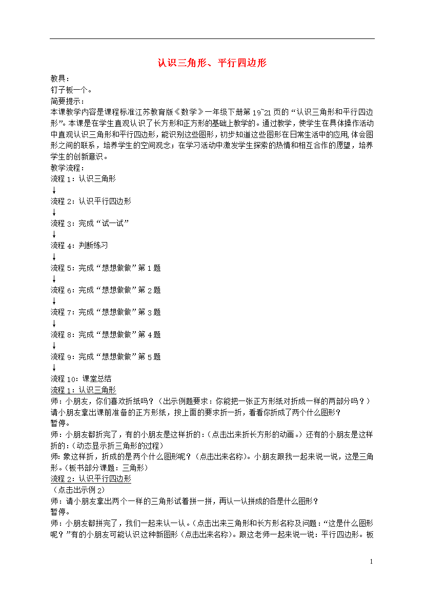 教案-全国-2012_一年级数学下册 认识三角形、平行四边形2教案 苏教版