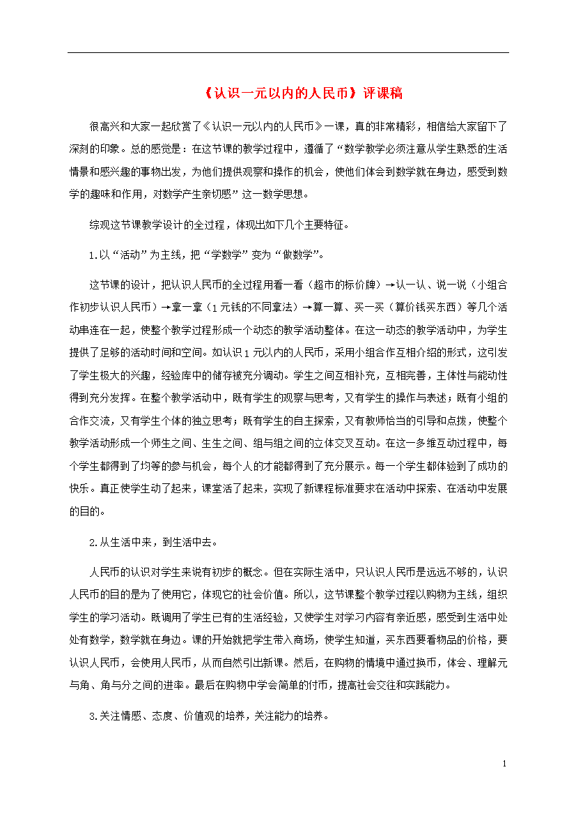 教案-全国-2012_一年级数学下册 认识一元以内的人民币1评课稿 苏教版