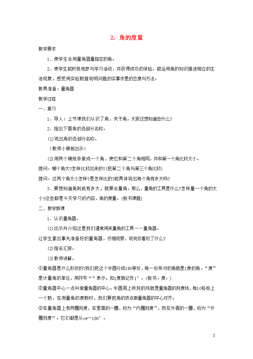 教案-全国-2019_四年级数学上册 第八单元 垂线与平行线 2 角的度量(1)教案 苏教版