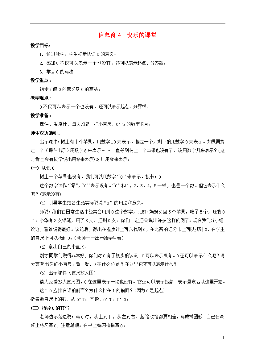 教案-全国-2011_一年级数学上册 信息窗4 快乐的课堂教案 青岛版