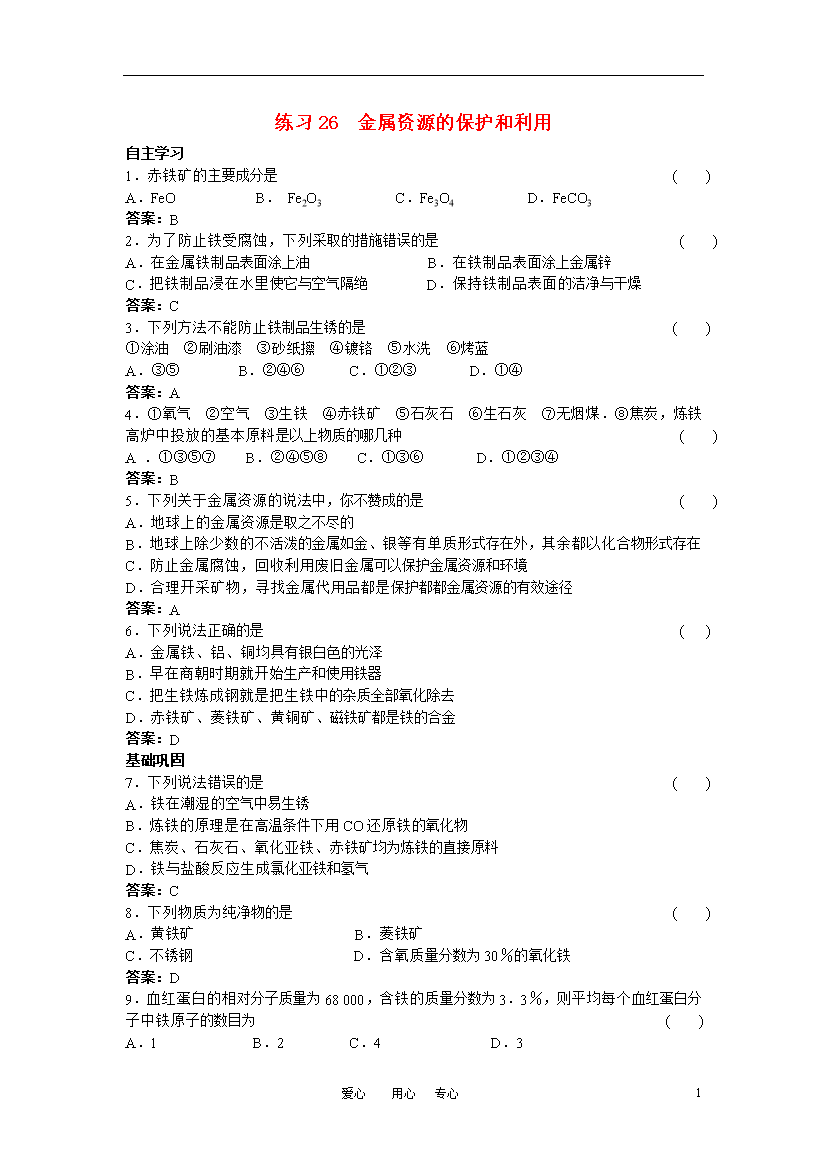 试题-全国-2010_2011年中考化学练习26 金属资源的保护和利用