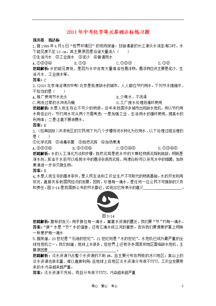 试题-全国-2010_2011年中考化学单元基础达标练习题 第三单元课题4 爱护水资源 (含教师版解析)
