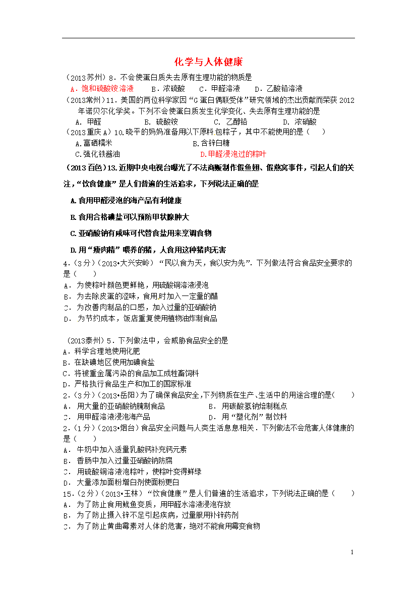 试题-云南-2016_云南省广南县篆角乡初级中学校2013年中考化学试题汇编 4 化学与社会发展 考点19 化学及其应用 3化学与人体健康 3食品安全问题