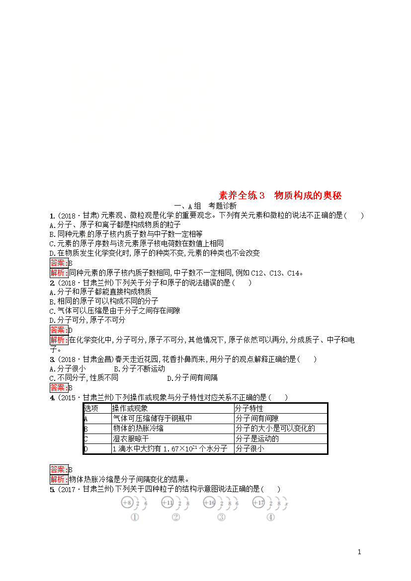 试题-全国-2018_(甘肃地区)2019年中考化学总复习 第三单元 物质构成的奥秘 素养全练3 物质构成的奥秘练习