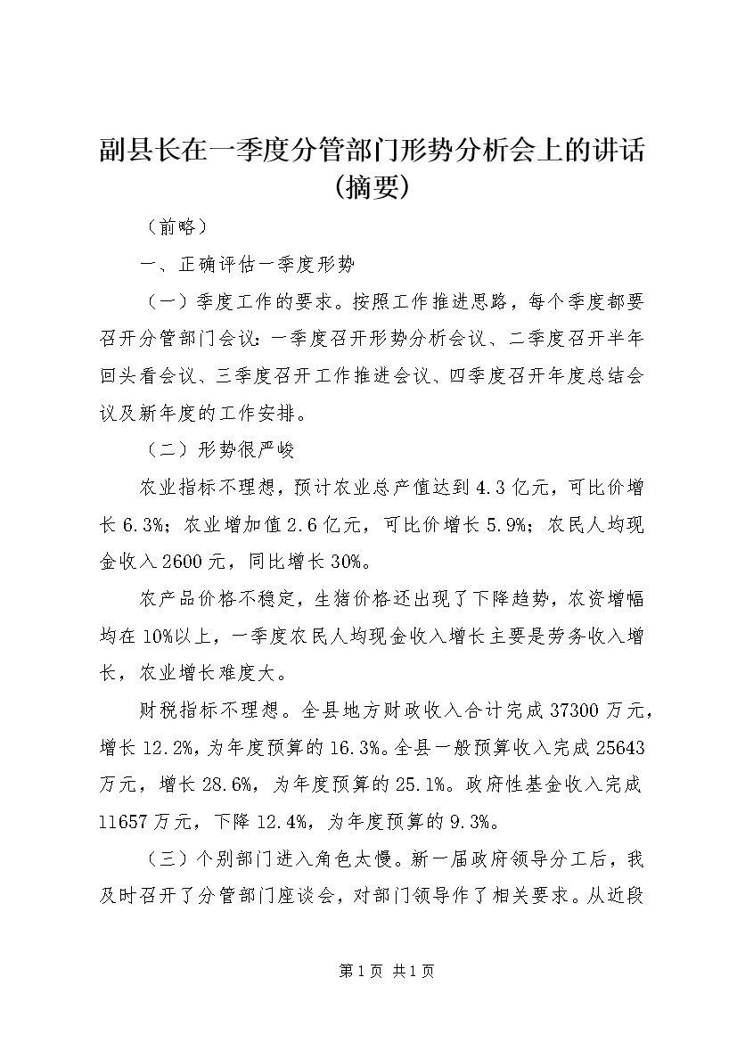 副县长在一季度分管部门形势分析会上的讲话(摘要)
