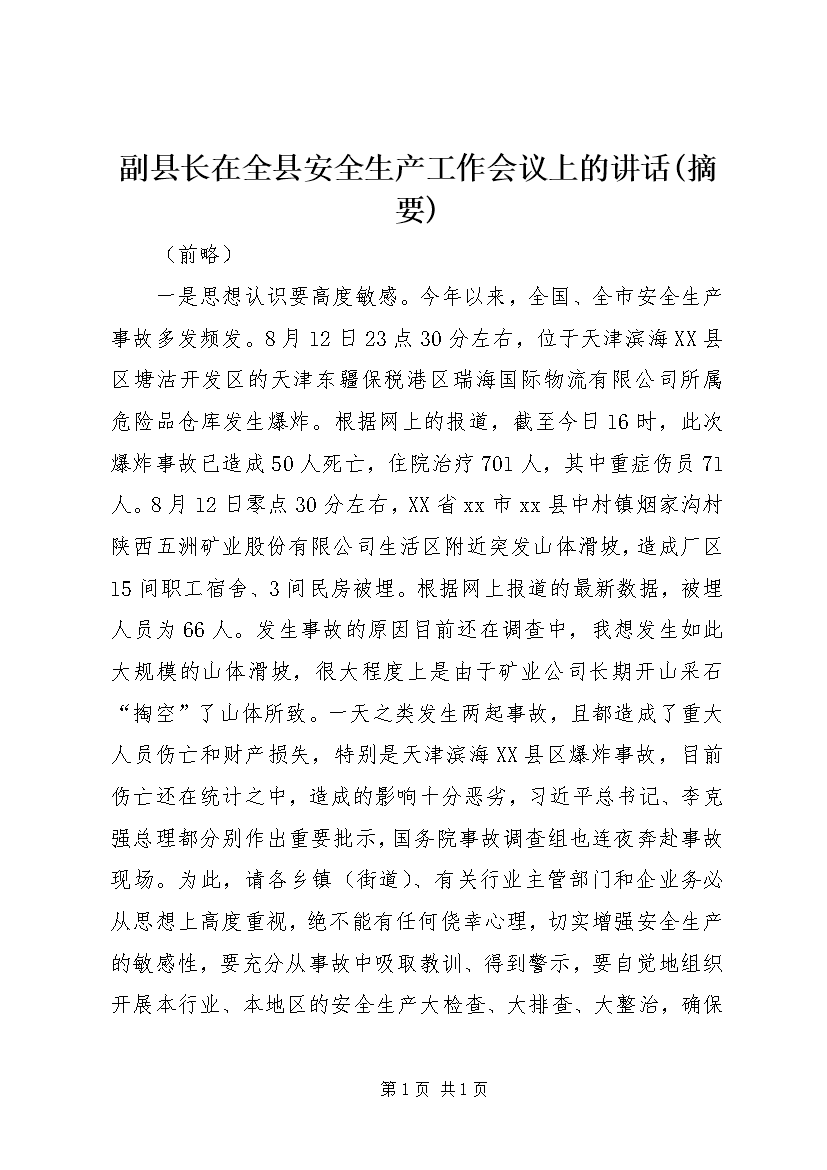 副县长在全县安全生产工作会议上的讲话(摘要)