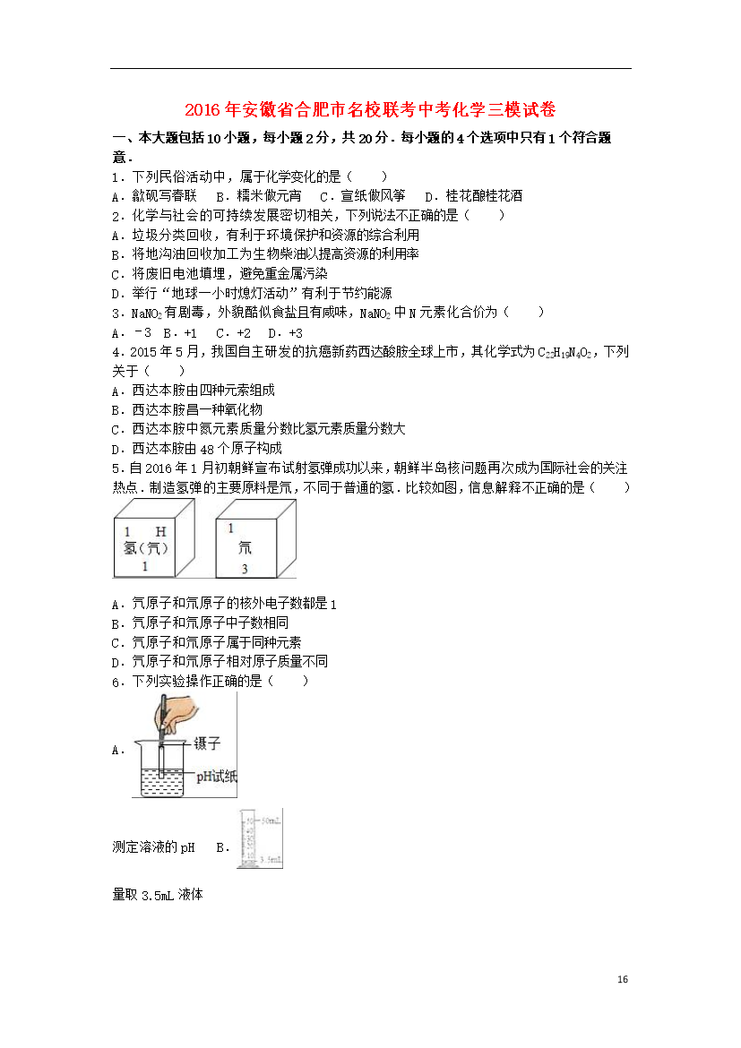 试题-安徽-2016_安徽省合肥市名校联考2016年中考化学三模试卷(含解析)