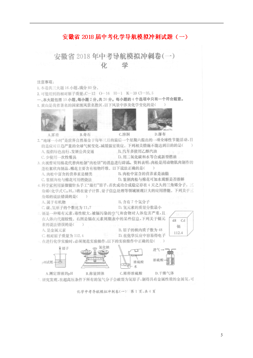试题-安徽-2018_安徽省2018届中考化学导航模拟冲刺试题(一)(扫描版)