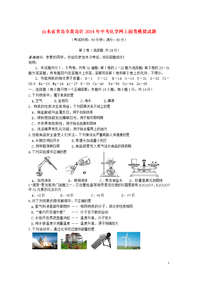 试题-山东-2015_山东省青岛市黄岛区2014年中考化学网上阅卷模拟试题(无答案)