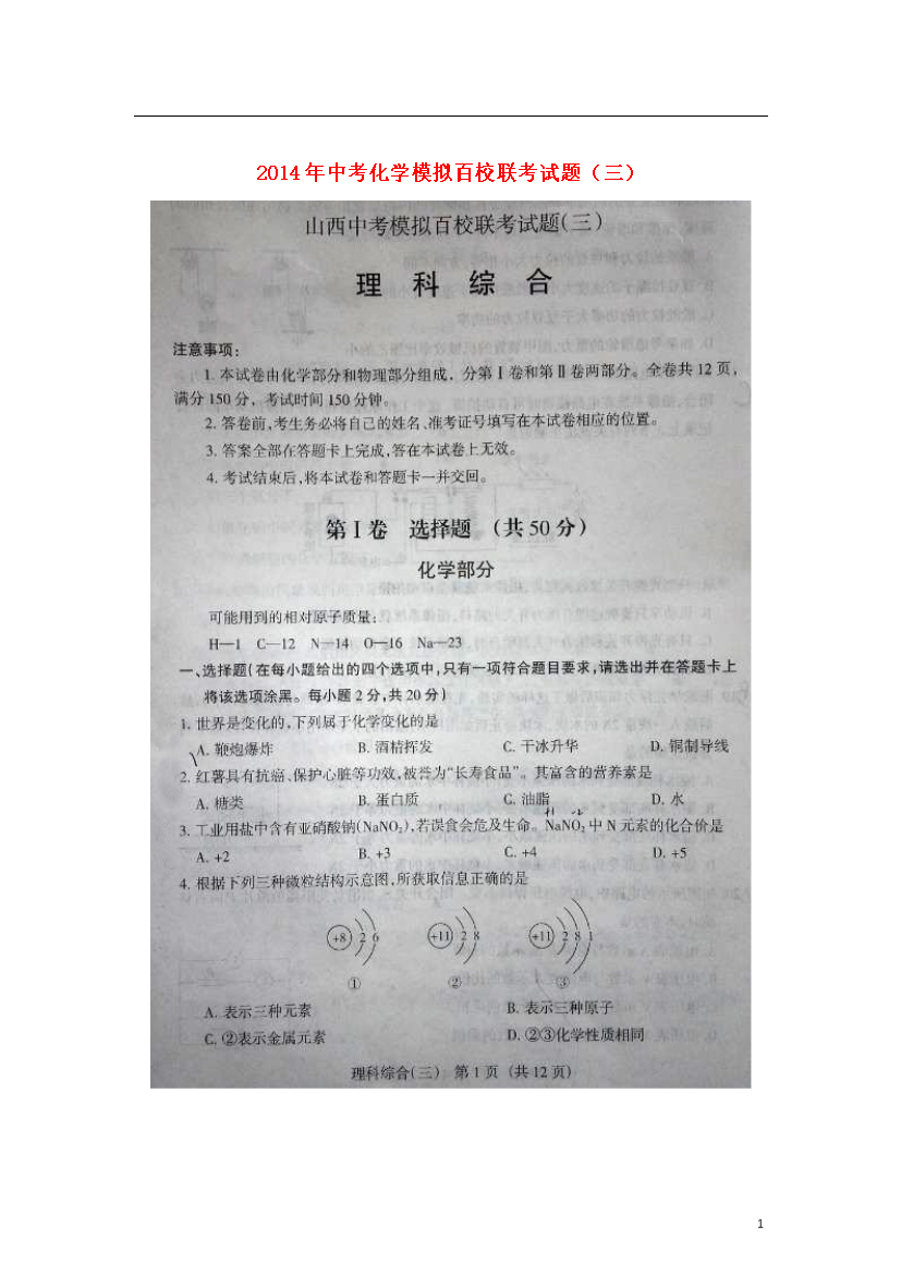 试题-山西-2014_山西省2014年中考化学模拟百校联考试题(三)(扫描版)