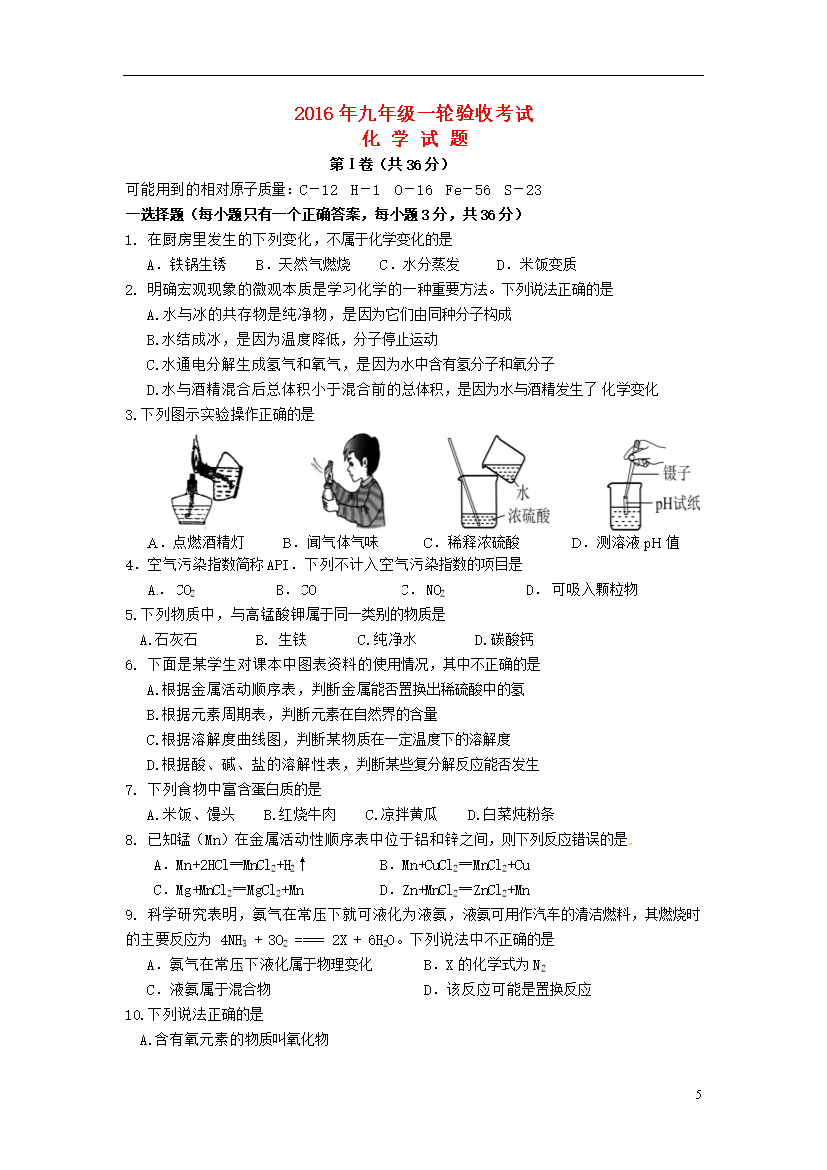 试题-山东-2016_山东省郯城县新村乡初级中学2016届九年级化学一轮验收试题