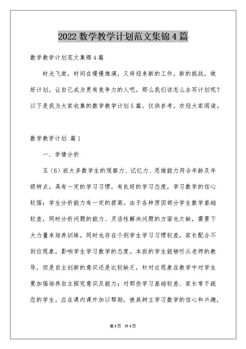 2022数学教学计划范文集锦4篇