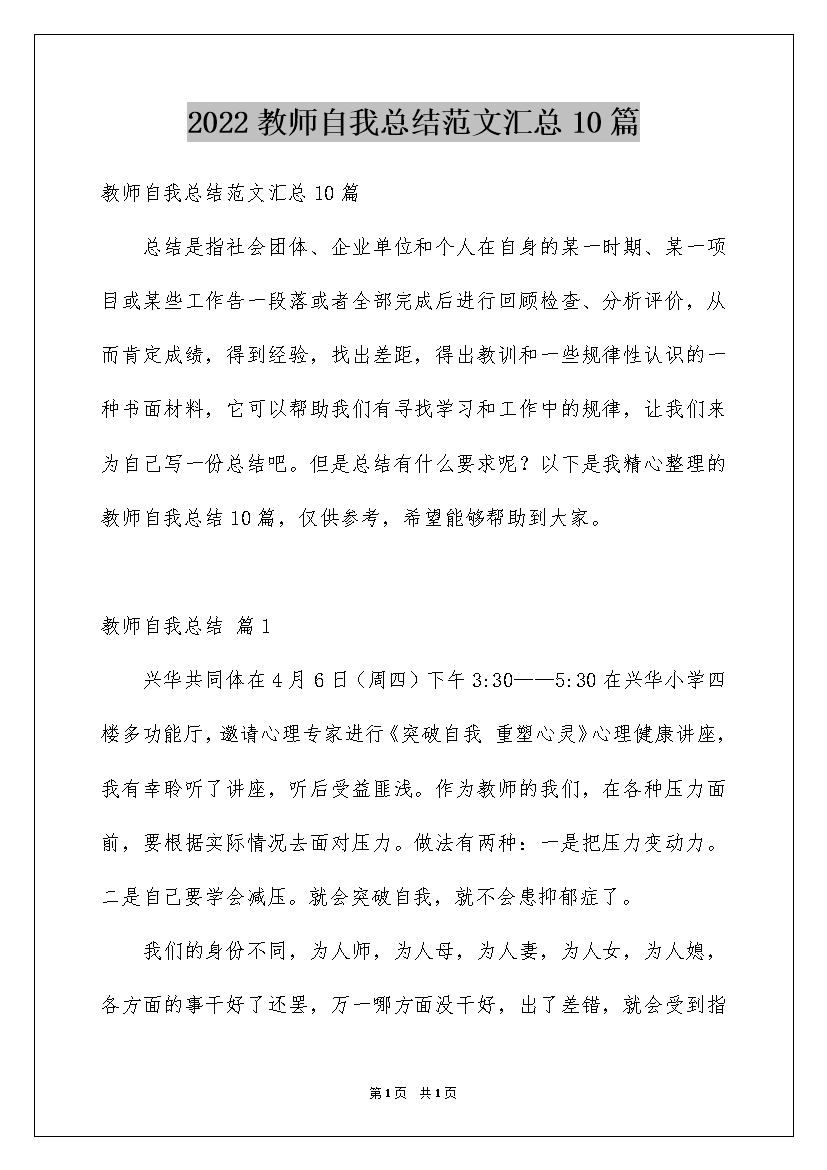 2022教师自我总结范文汇总10篇