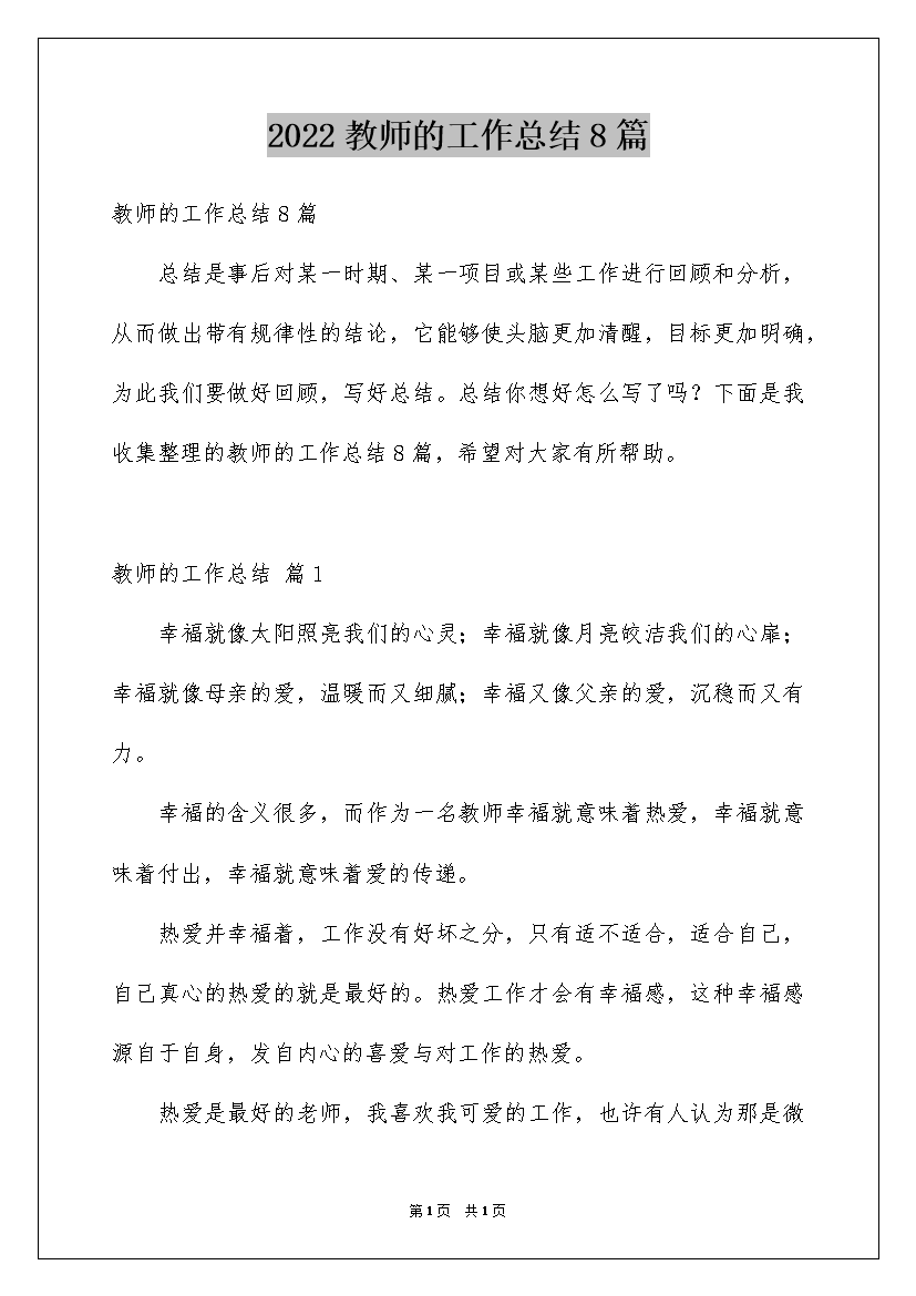 2022教师的工作总结8篇