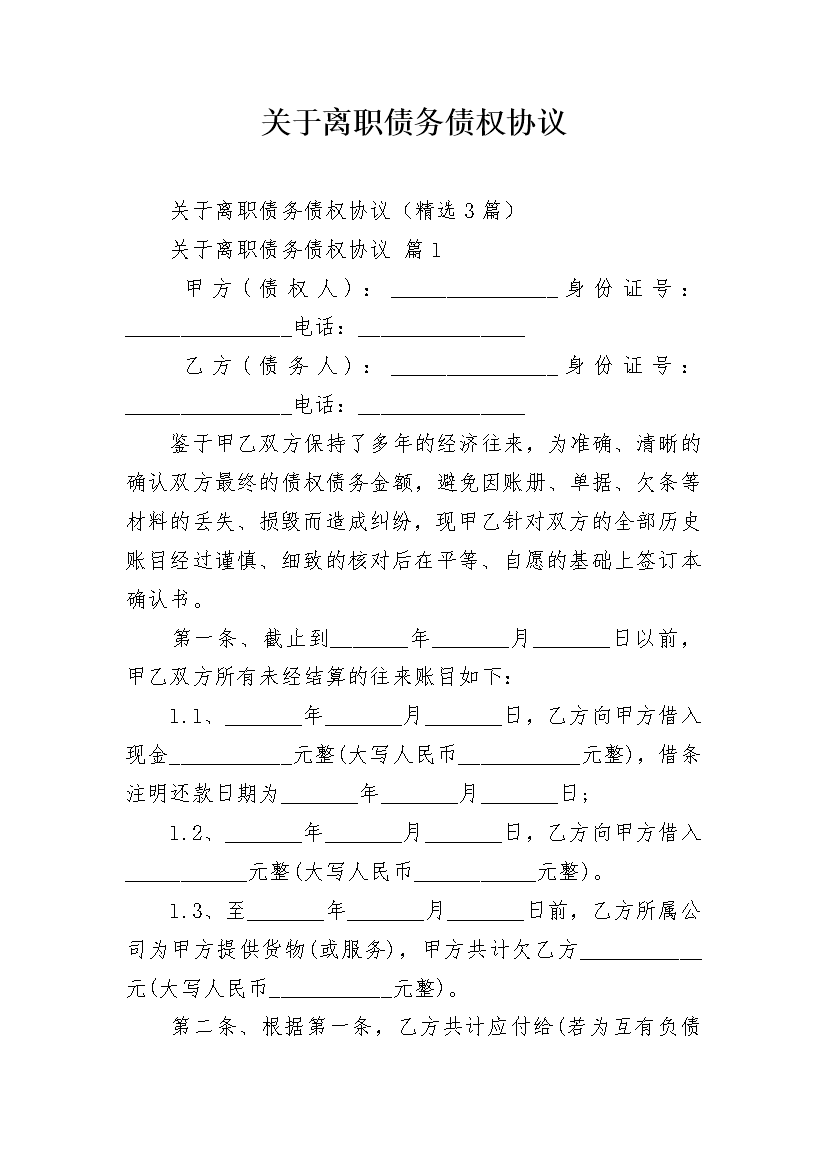 关于离职债务债权协议