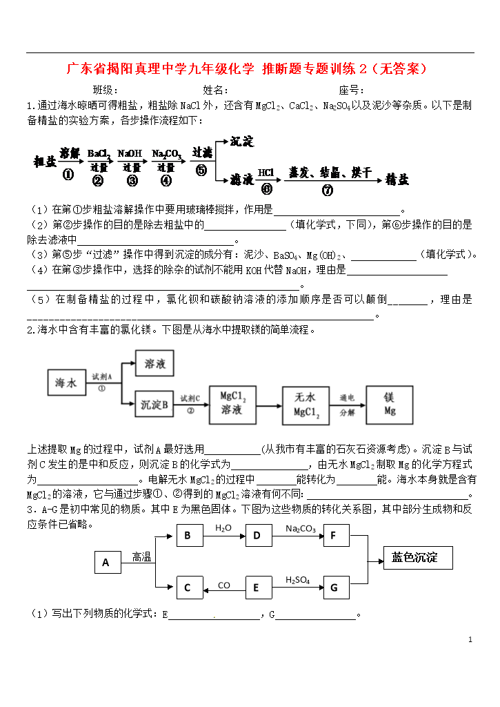 试题-广东-2013_广东省揭阳真理中学九年级化学 推断题专题训练2(无答案)