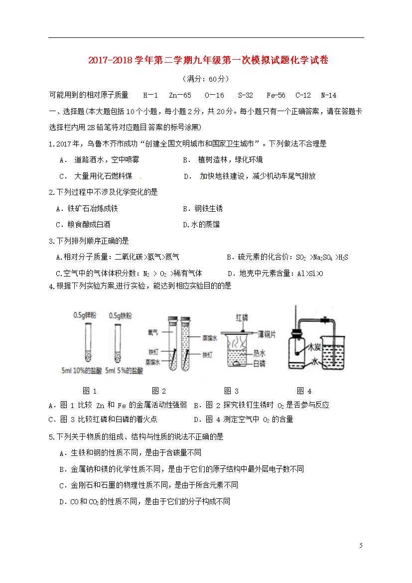 试题-新疆-2018_新疆乌鲁木齐市2018届九年级化学下学期第一次模拟考试试题(无答案)