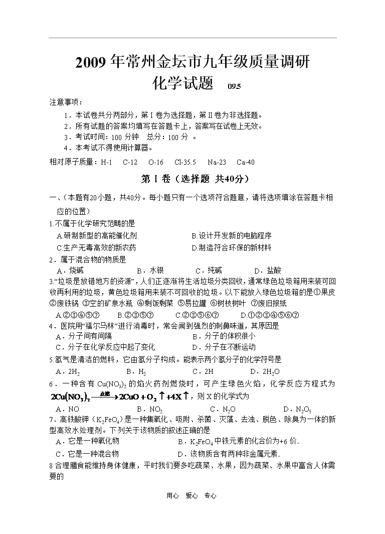 试题-江苏-2009_2009年江苏省常州金坛市九年级化学质量调研