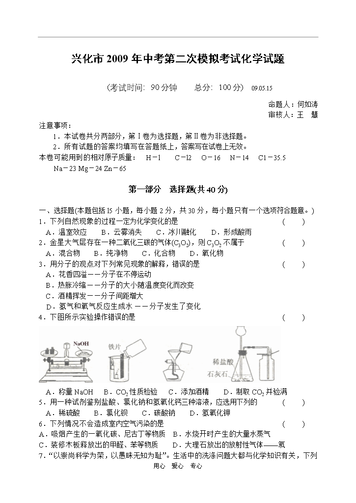 试题-江苏-2009_2009年江苏省兴化市中考九年级化学第二次模拟考试试题有答案
