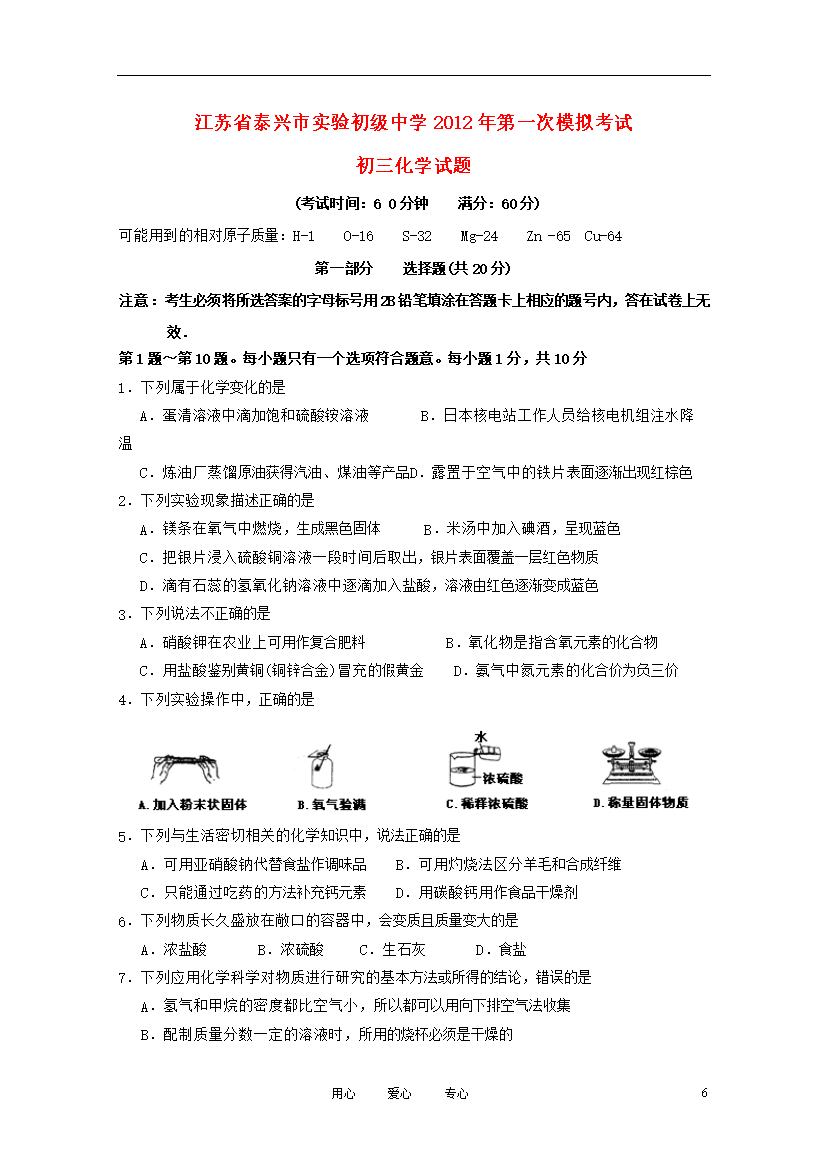 试题-江苏-2012_江苏省泰兴市实验初级中学2012年九年级化学第一次模拟考试试题