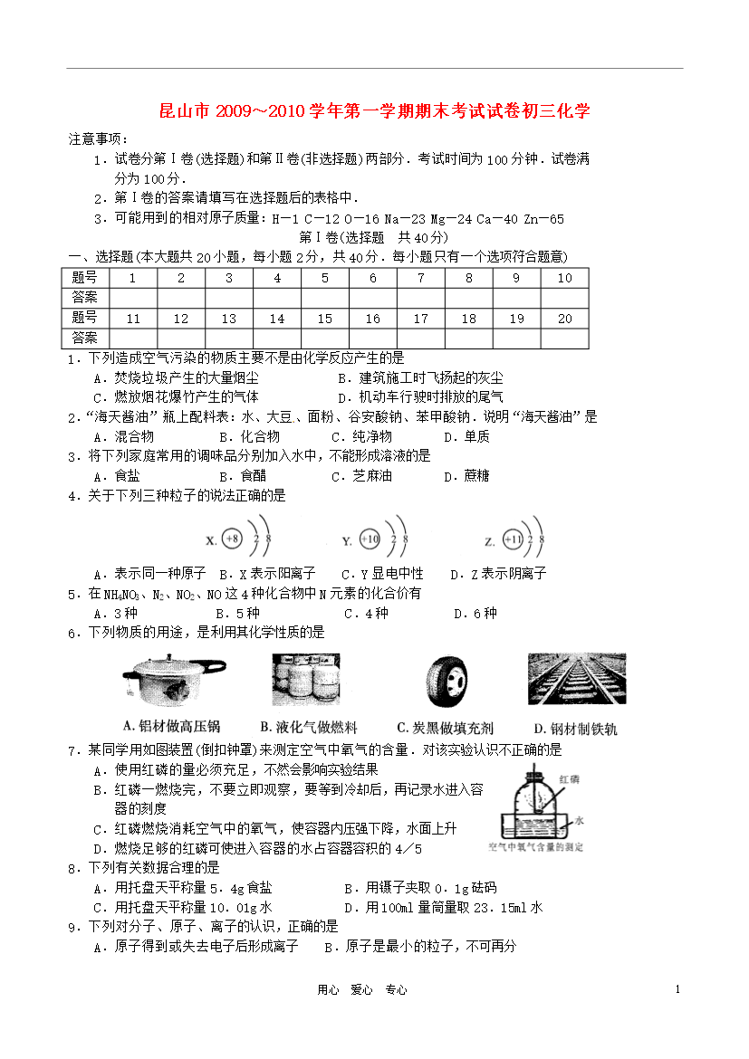 试题-江苏-2011_江苏省昆山市2010届九年级化学上学期期末考试试题