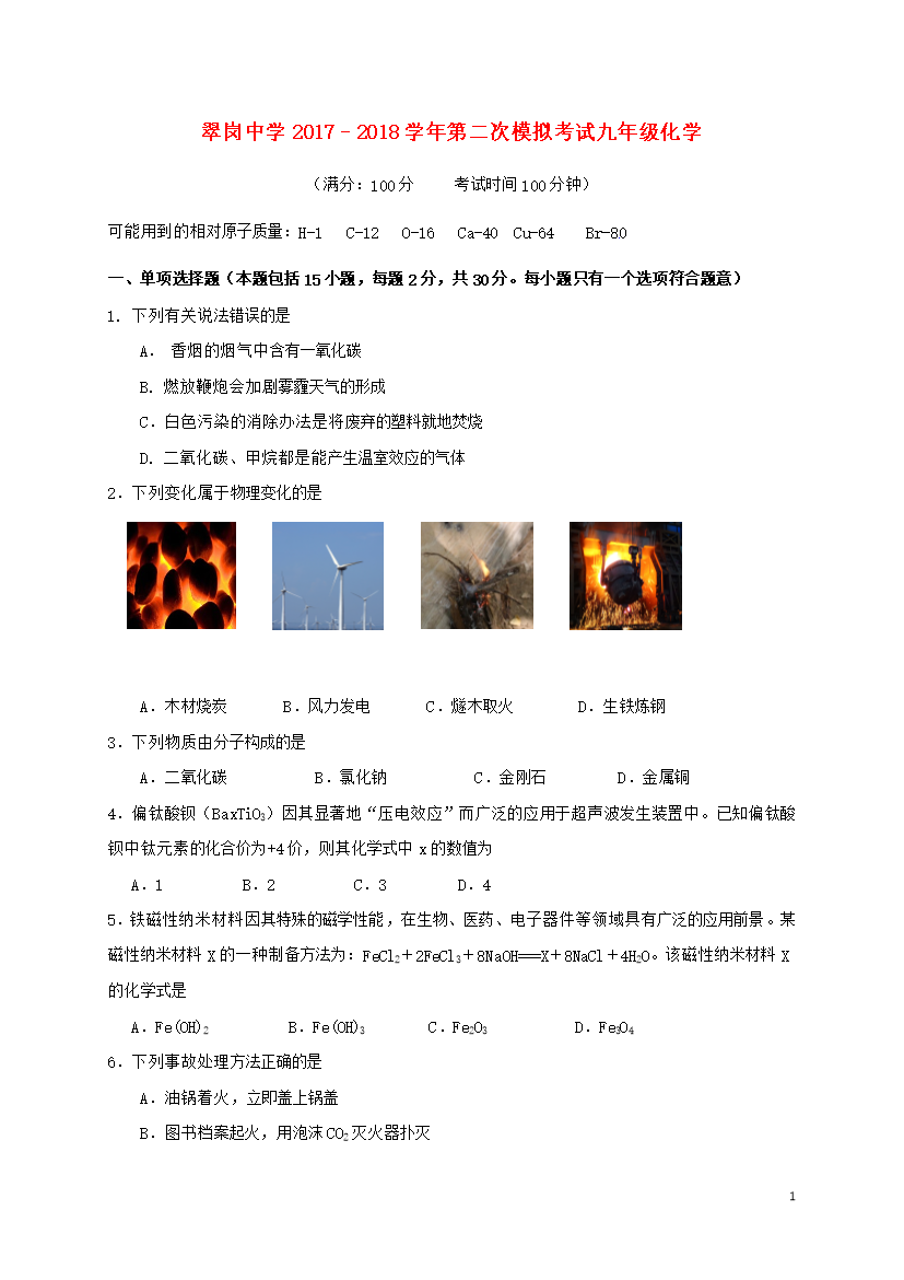试题-江苏-2018_江苏省扬州市翠岗中学2018届九年级化学下学期第二次模拟考试试题