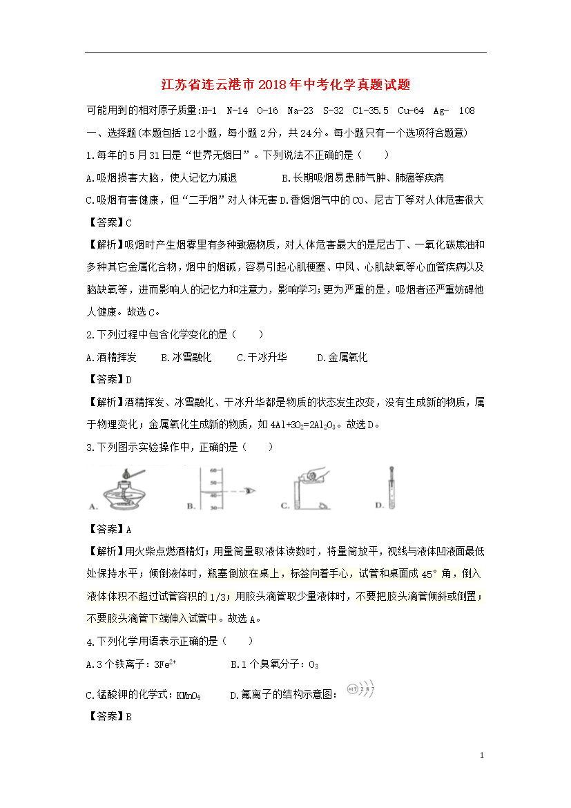 试题-江苏-2018_江苏省连云港市2018年中考化学真题试题(含解析)