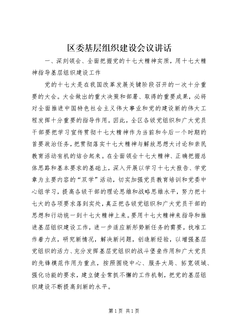区委基层组织建设会议讲话
