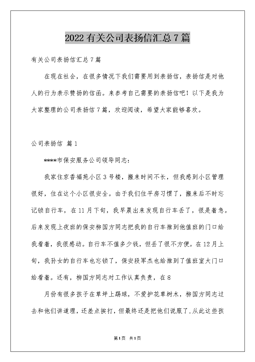 2022有关公司表扬信汇总7篇