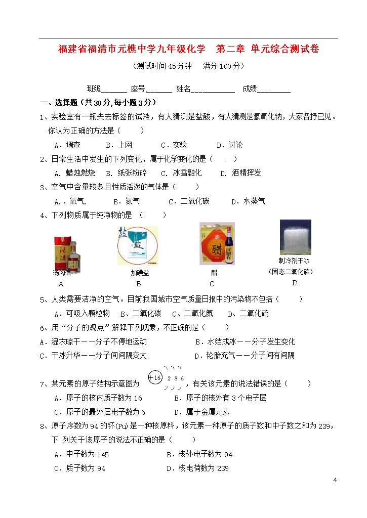 试题-福建-2014_福建省福清市元樵中学九年级化学 第二章单元综合测试卷(无答案)