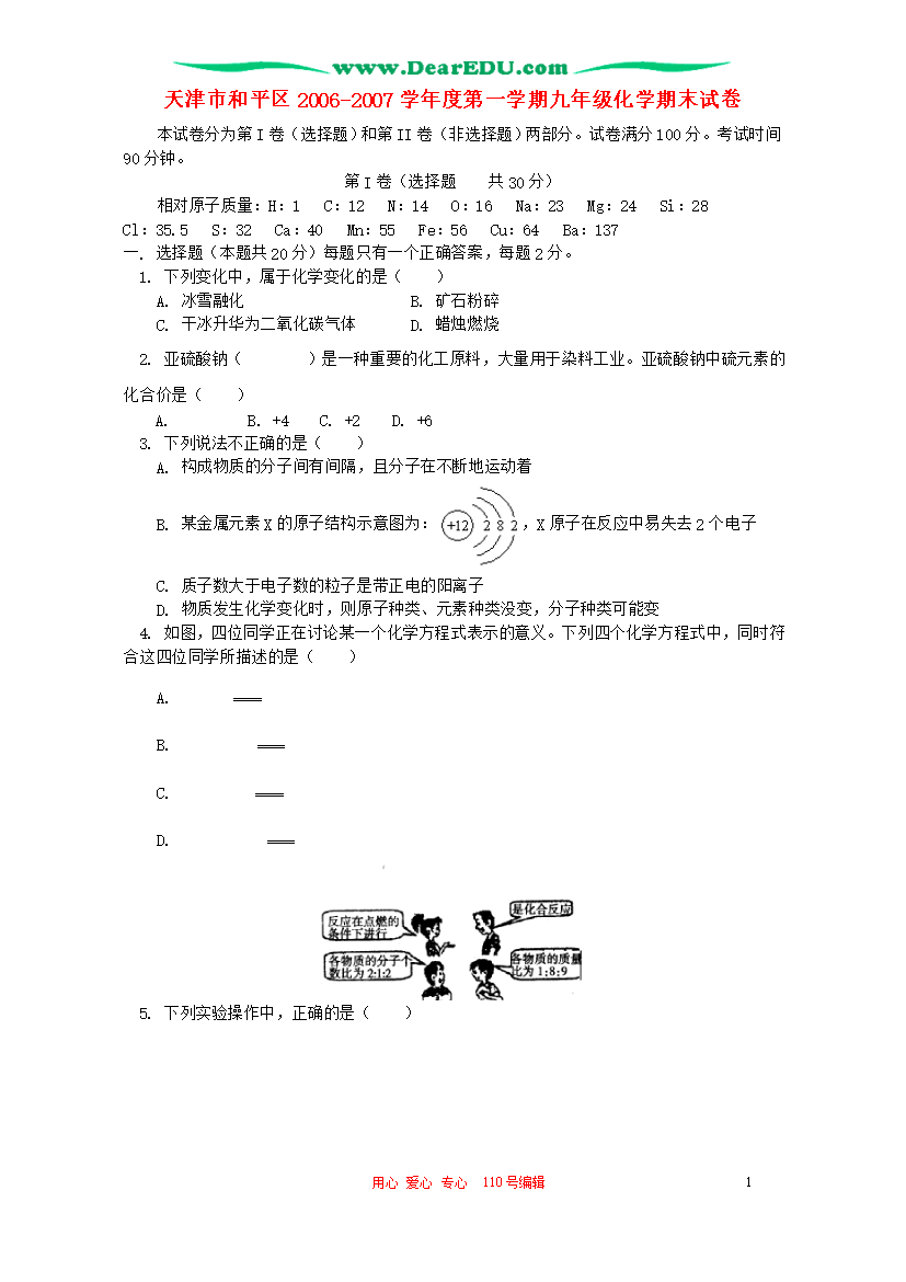 试题-湖南-2007_天津市和平区2006-2007学年度第一学期九年级化学期末试卷