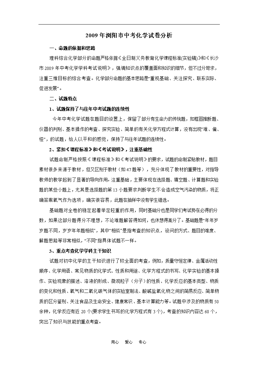 试题-湖南-2009_2009年湖南省浏阳市中考化学试卷分析