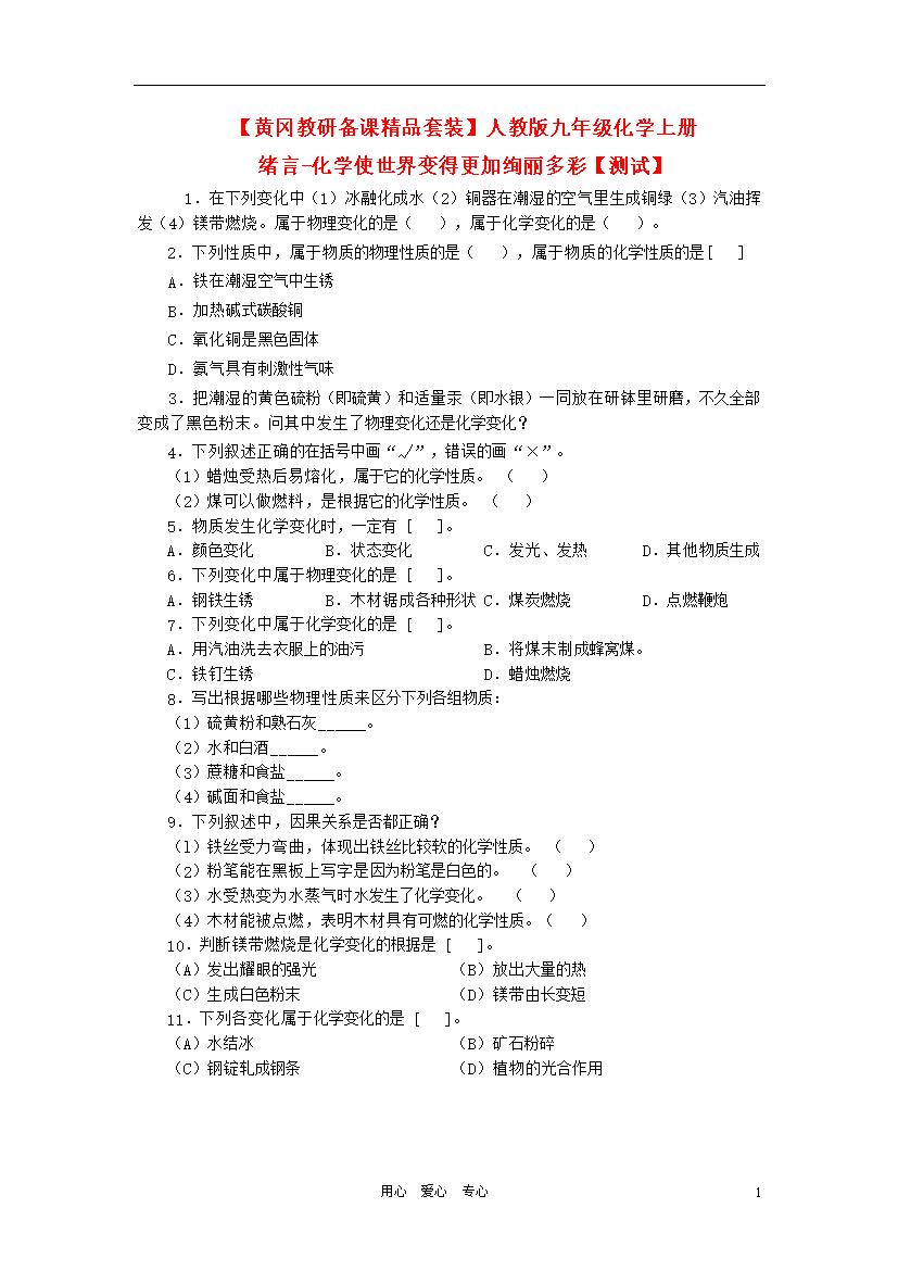 试题-全国-2011_黄冈教研备课精品套装九年级化学上册 绪言-化学使世界变得更加绚丽多彩单元测试 人教新课标版