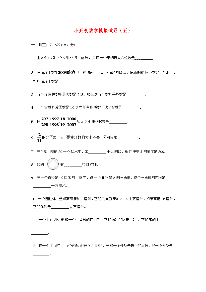 试题-全国-2013_六年级数学上册 小升初模拟试卷(五) 冀教版