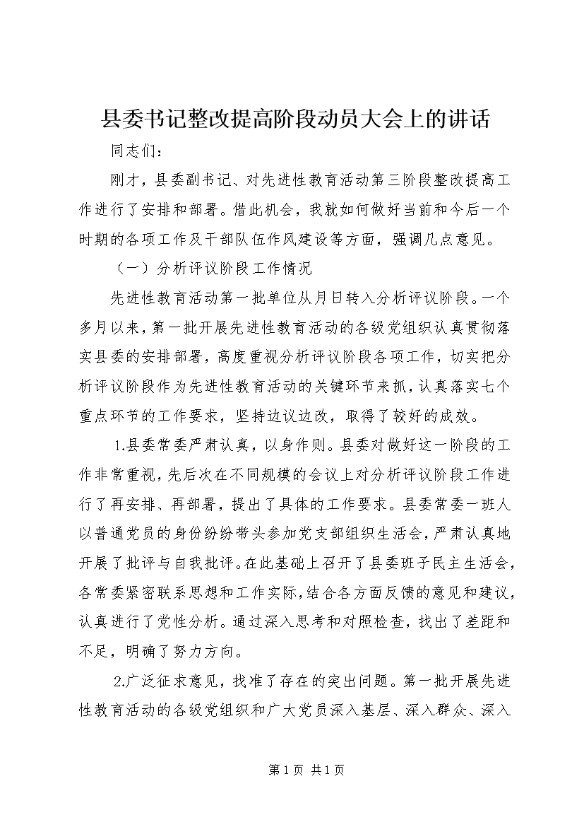 县委书记整改提高阶段动员大会上的讲话