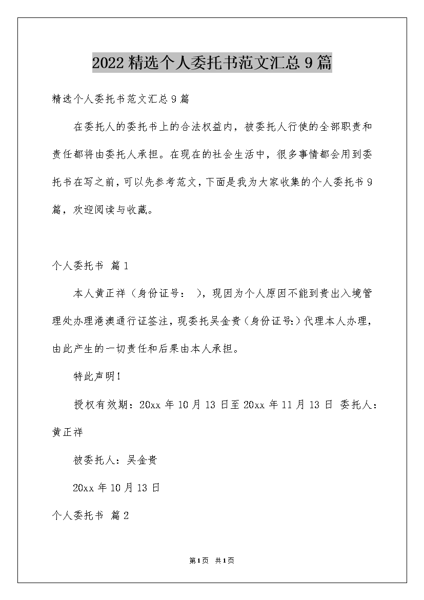 2022精选个人委托书范文汇总9篇