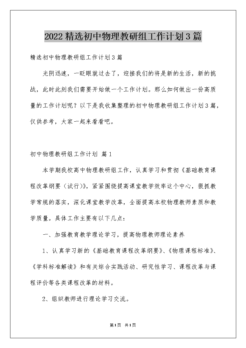 2022精选初中物理教研组工作计划3篇