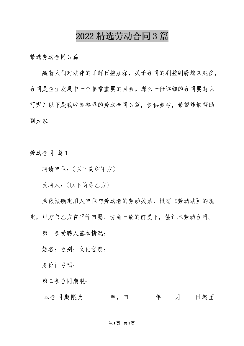 2022精选劳动合同3篇
