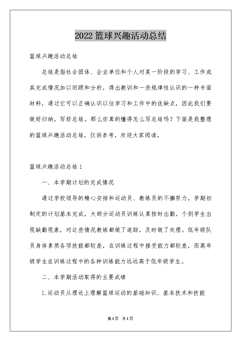 2022篮球兴趣活动总结