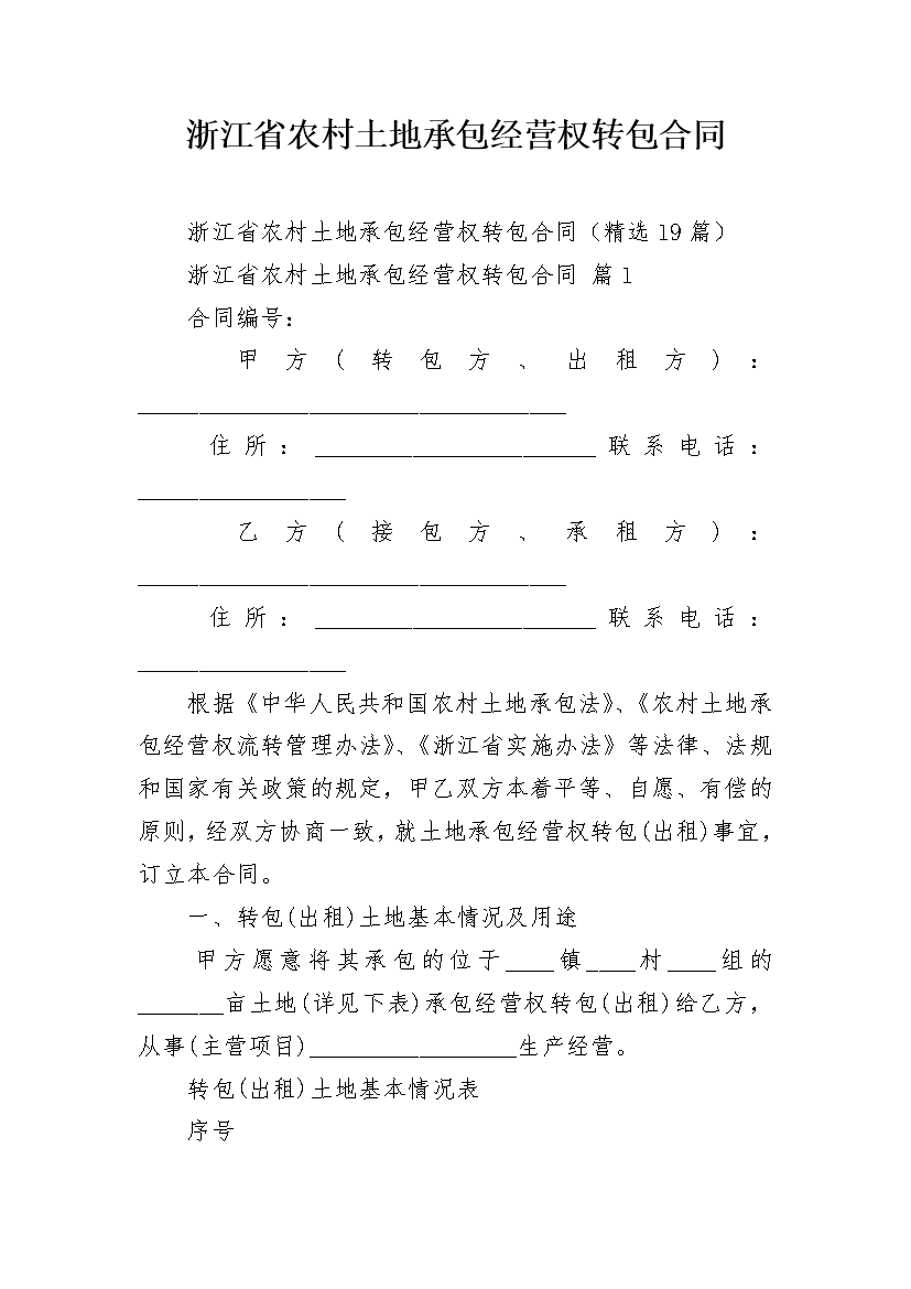 浙江省农村土地承包经营权转包合同